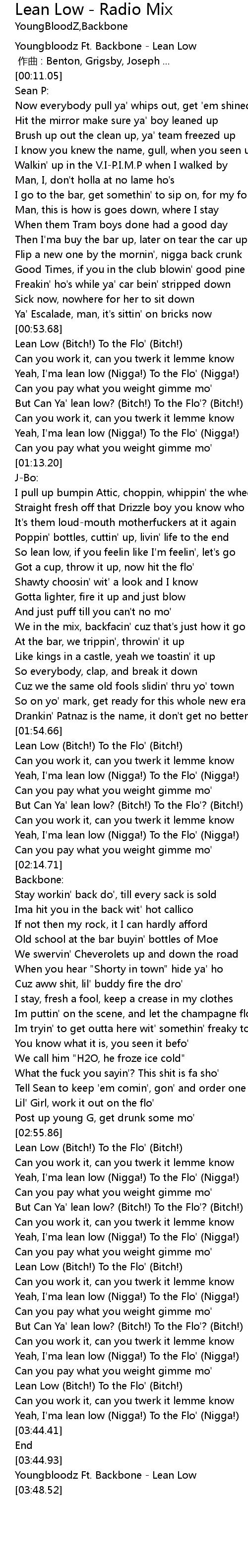 | [00:53.78] | Lean Low (Bitch!) To the Flo' (Bitch!) |