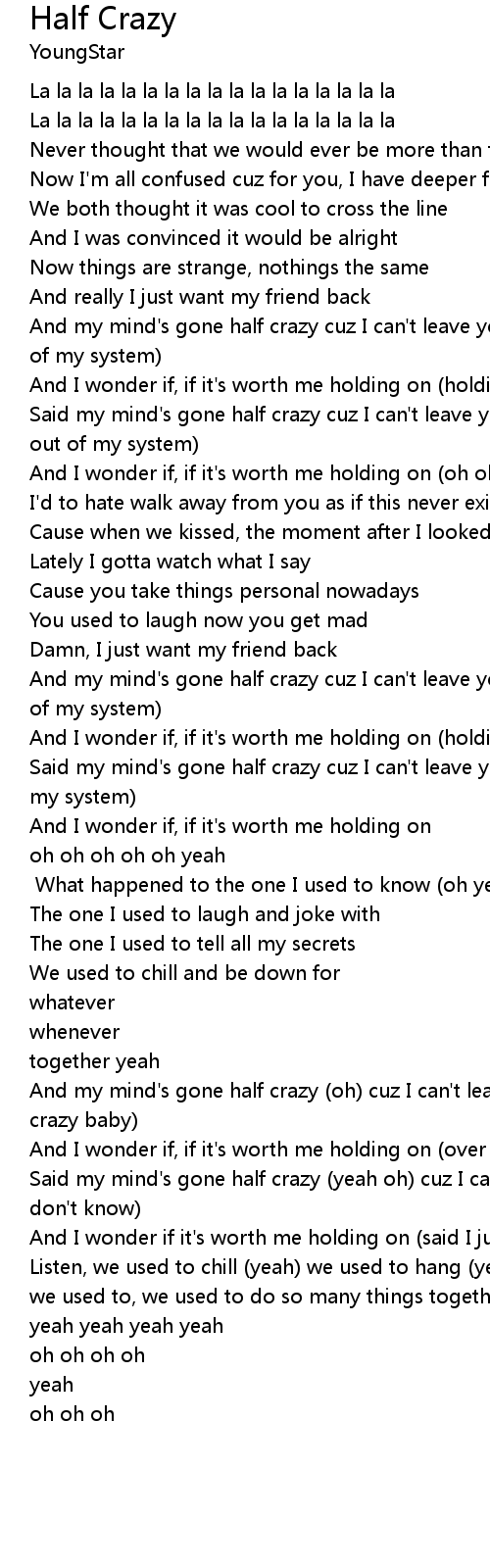 Said my mind's gone half crazy (yeah oh) cuz I can't leave you alone (and I just don't know) |