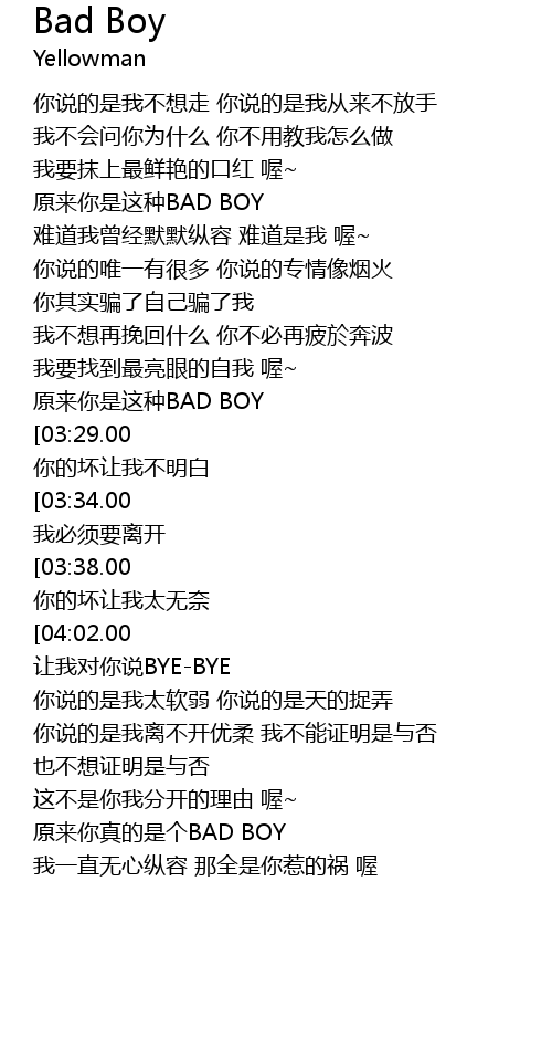 | [03:57.00][03:38.00][02:41.00][02:23.00][01:23.00] | nǐ shì BAD BOY BAD BOY nǐ de huài ràng wǒ tài wú nài |