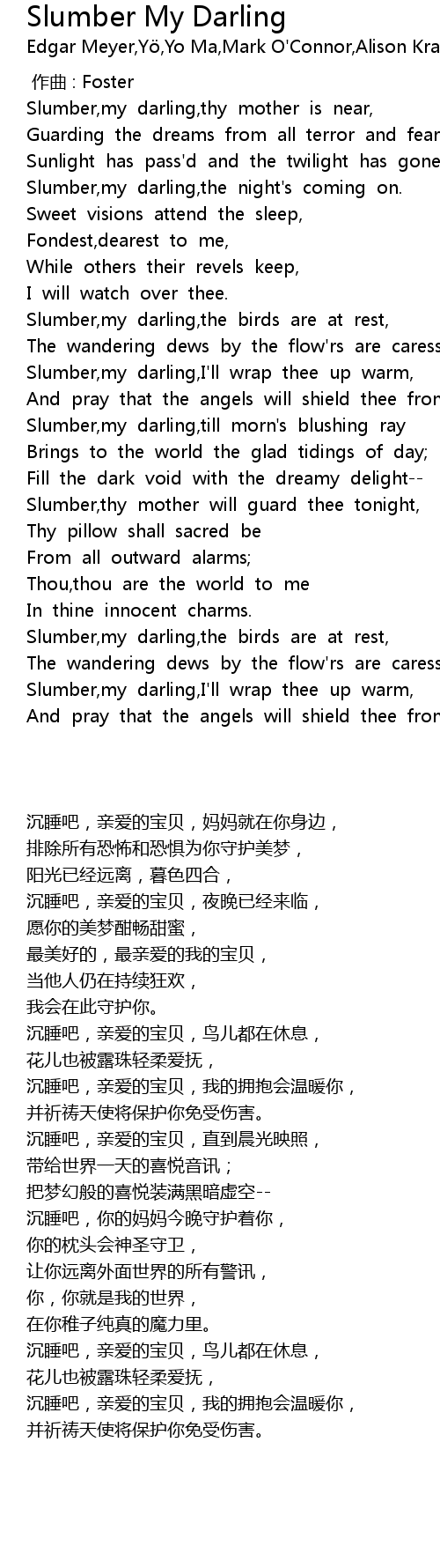| [00:45.04] | Slumber, my darling, the night' s coming on. |