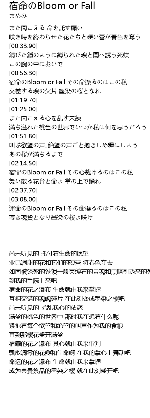 | [00:57.00] | 宿命のBloom or Fall その命操るのはこの私 |