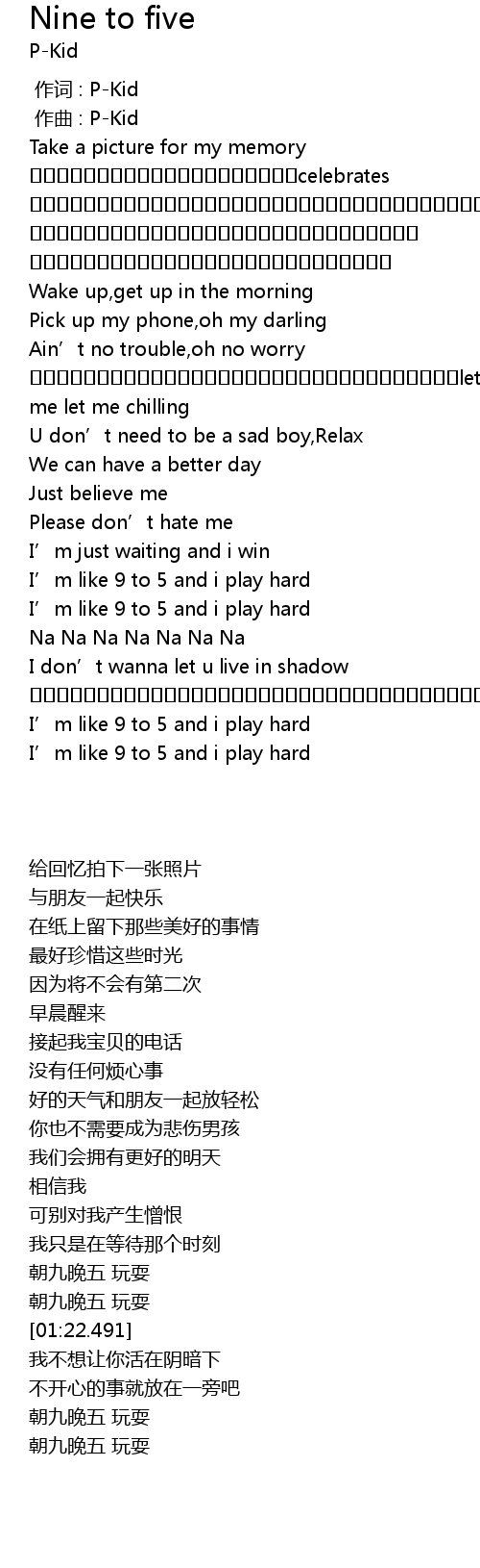 | [01:52.319] | I' m like 9 to 5 and i play hard |