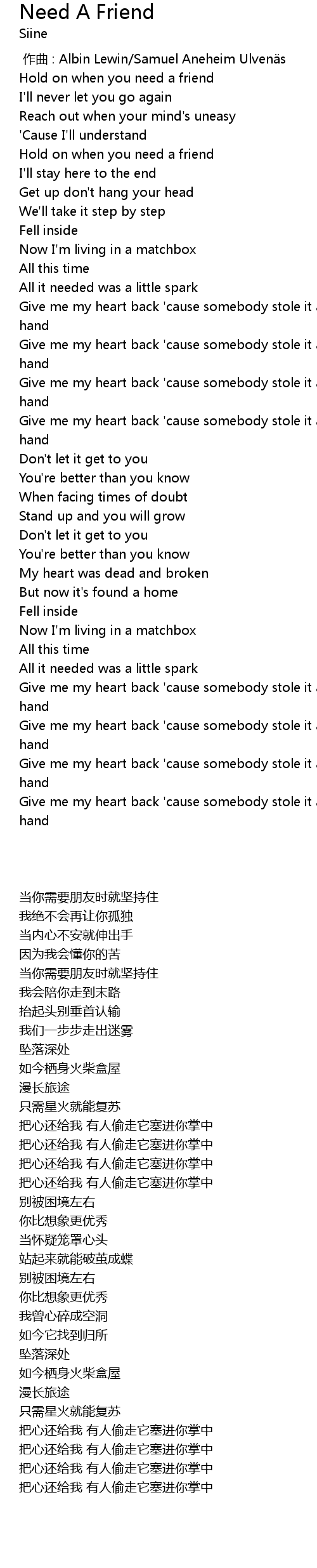 | [00:18.535] | Hold on when you need a friend |
