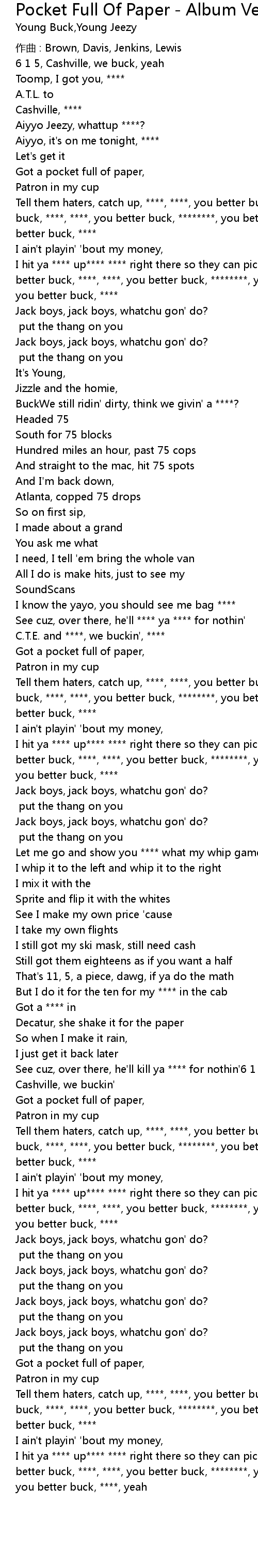 | Tell them haters, catch up, ****, ****, you better buck, ********, you better buck, ****, ****, you better buck, ********, you better buck, ****, ****, you better buck, **** | |