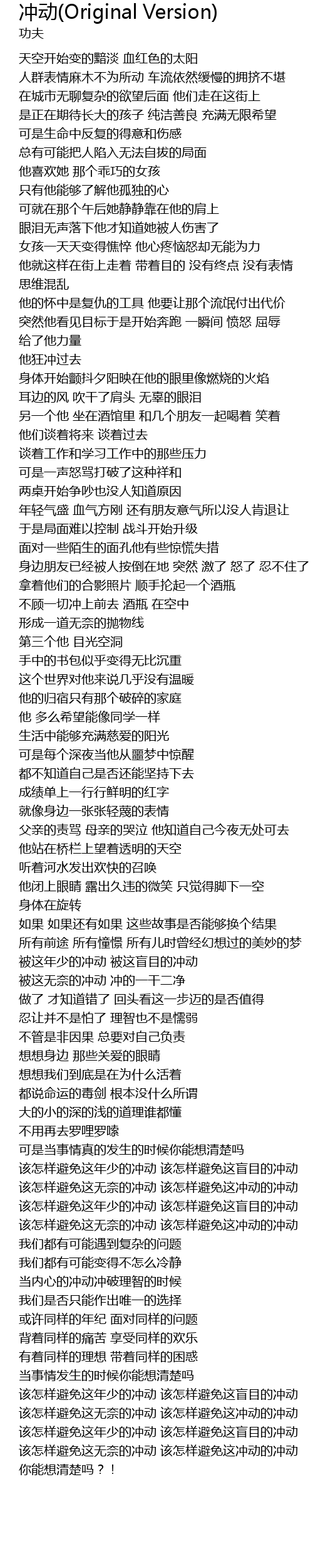 | [05:19.48] | gāi zěn yàng bì miǎn zhè wú nài de chōng dòng gāi zěn yàng bì miǎn zhè chōng dòng de chōng dòng |