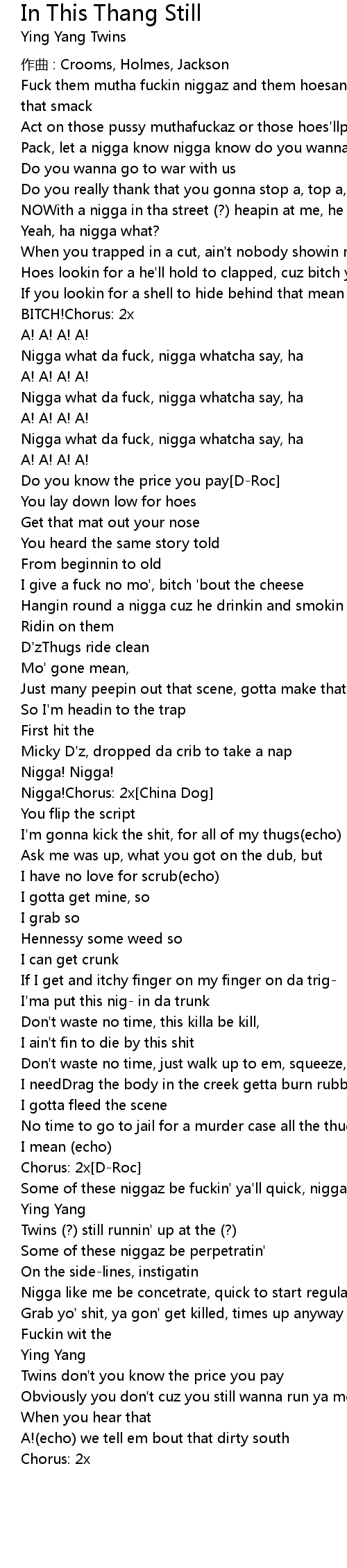 | NOWith a nigga in tha street (?) heapin at me, he a true city thug | |