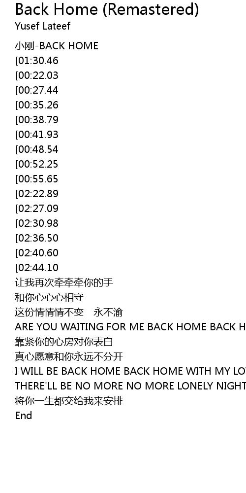| [03:45.62] | I WILL BE BACK HOME BACK HOME WITH MY LOVE |