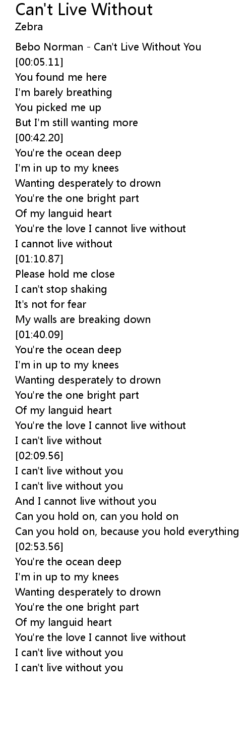 | [00:01.38] | Bebo Norman - Can't Live Without You |