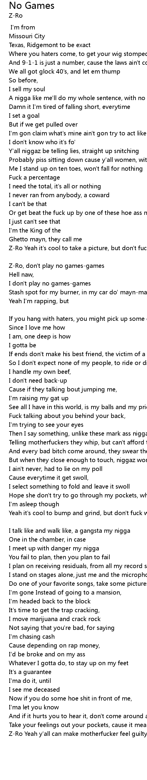 | Z-Ro Yeah y'all can make motherfucker feel guilty, but not me though [Hook x3] |