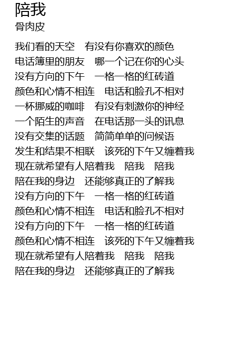 | xiàn zài jiù xī wàng yǒu rén péi zhe wǒ péi wǒ péi wǒ | |