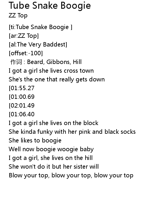 | [00:41.55][01:00.69][01:58.18] | She do the tube snake boogie |