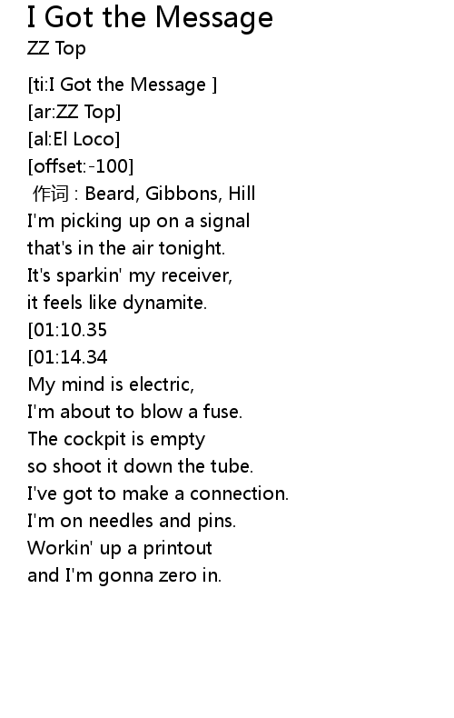 | [00:46.82][01:10.35][02:14.35] | I got the message |