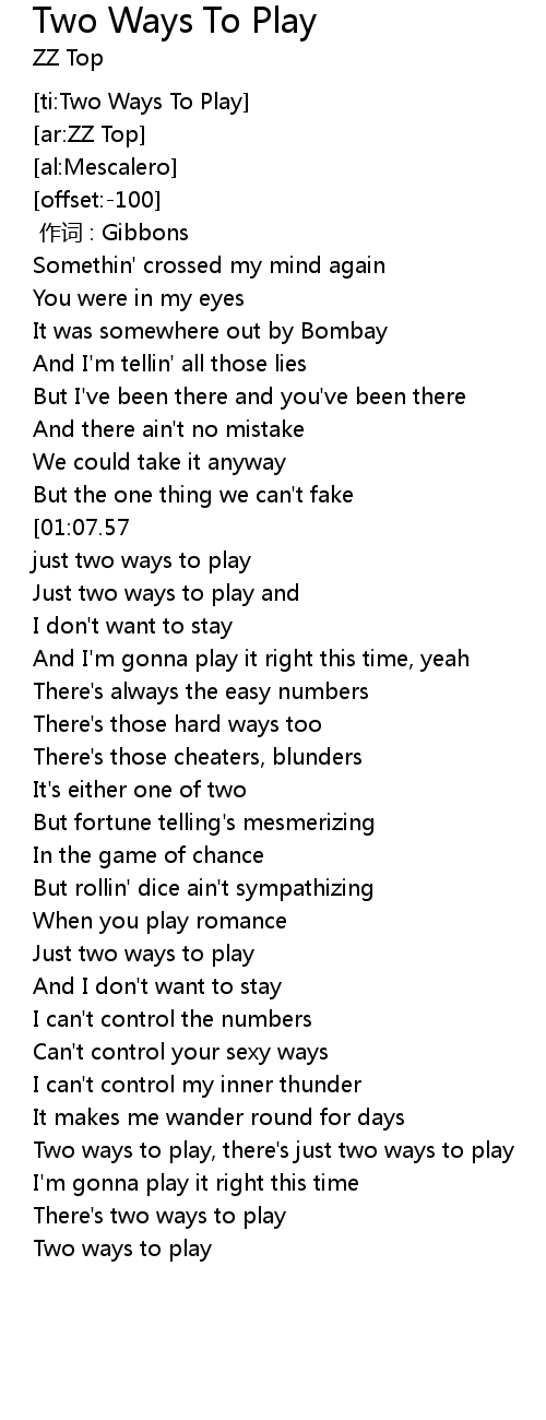 | [00:50.04][01:07.57][01:42.59][02:00.32][03:03.27][03:20.77][03:32.48] | There's just two ways to play |