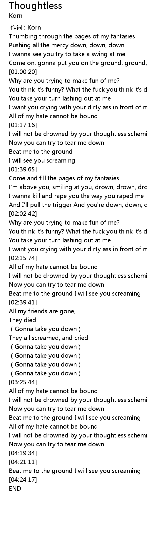 | [01:52.13] | I wanna kill and rape you the way you raped me |