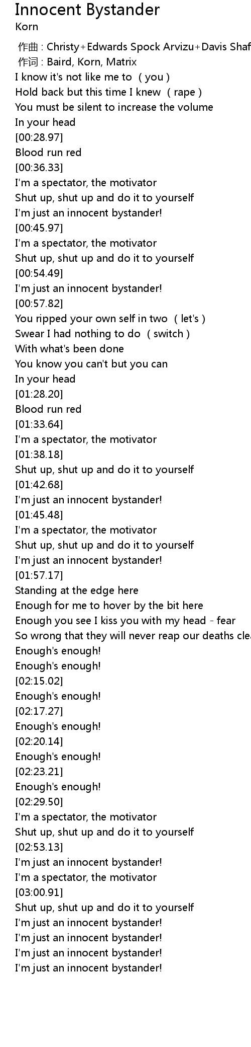 | [00:01.00] | 作词 : Baird, Korn, Matrix |