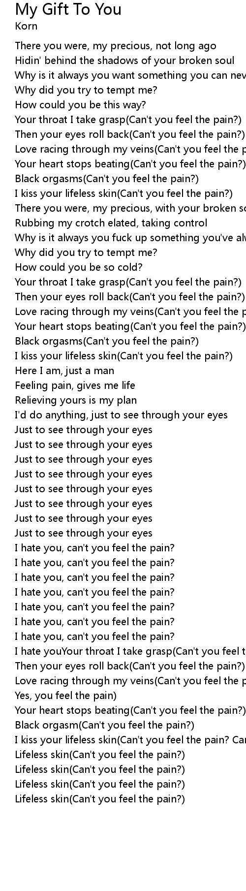 | I kiss your lifeless skin Can' t you feel the pain? Can' t you feel the pain? | |