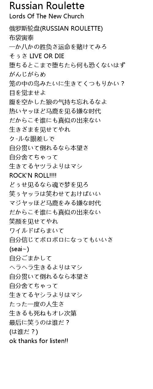| [00:03.73] | e luo si lun pan RUSSIAN ROULETTE |