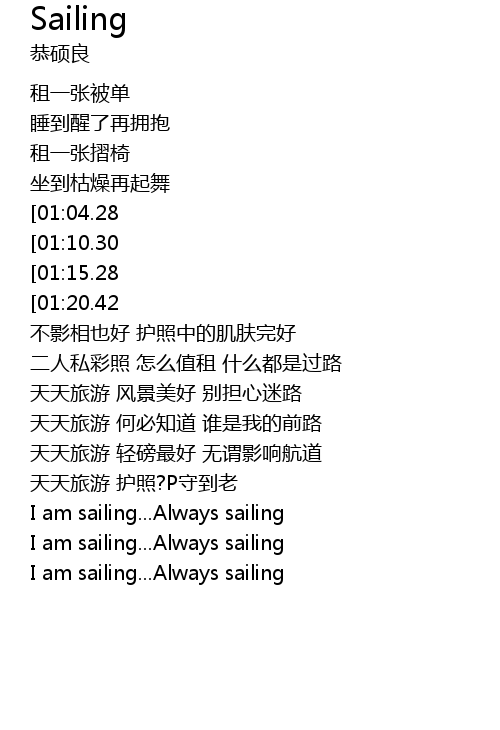 | [02:03.78][01:10.30] | 即将远行 时光不早 无什么不能做 |