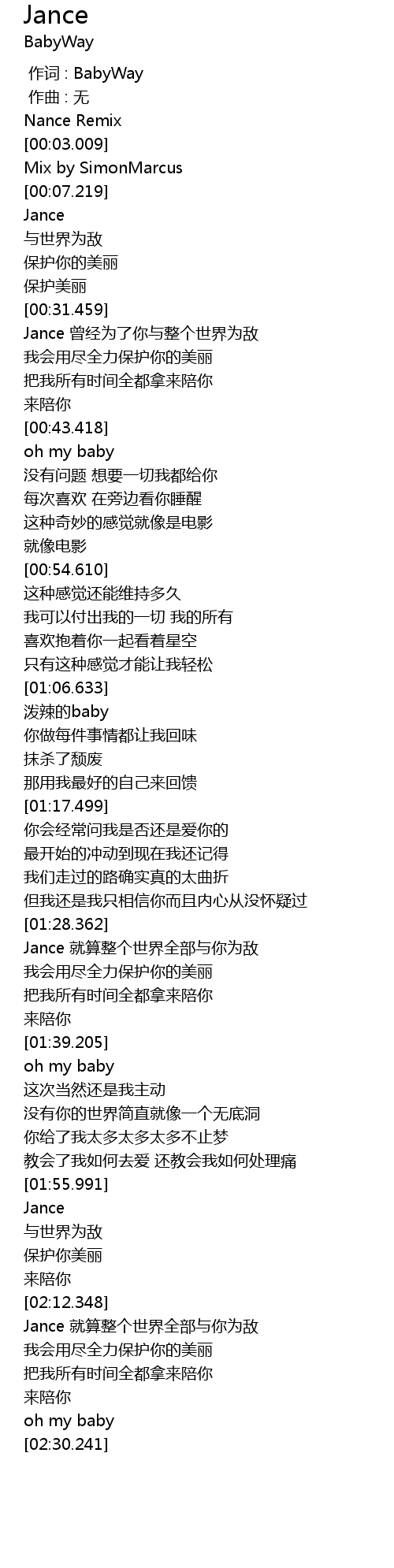 | [00:33.194] | Jance 曾经为了你与整个世界为敌 |