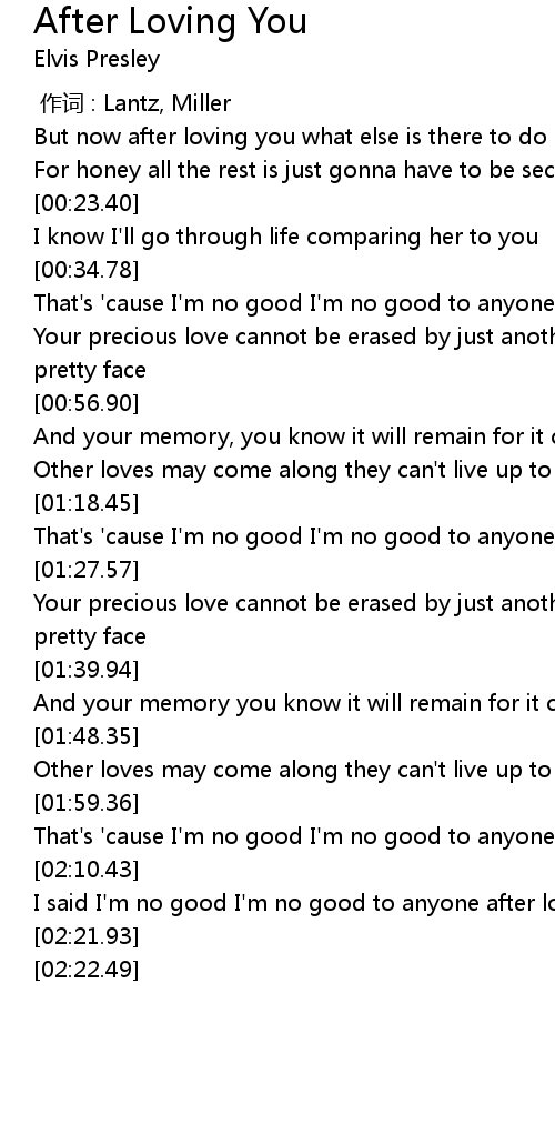 | [00:35.71] | That's 'cause I'm no good I'm no good to anyone after loving you |