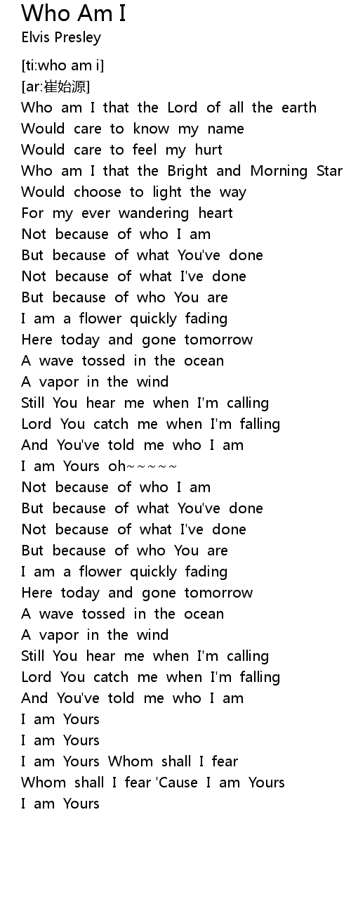 | [02:58.790] | Whom shall I fear ' Cause I am Yours |