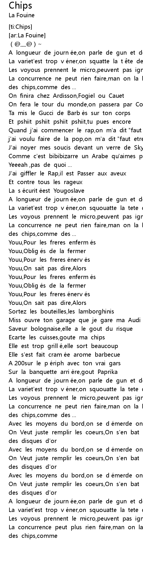 | [02:22.834] | On Veut juste remplir les coeurs,On s'en bat les couilles des disques d'or |