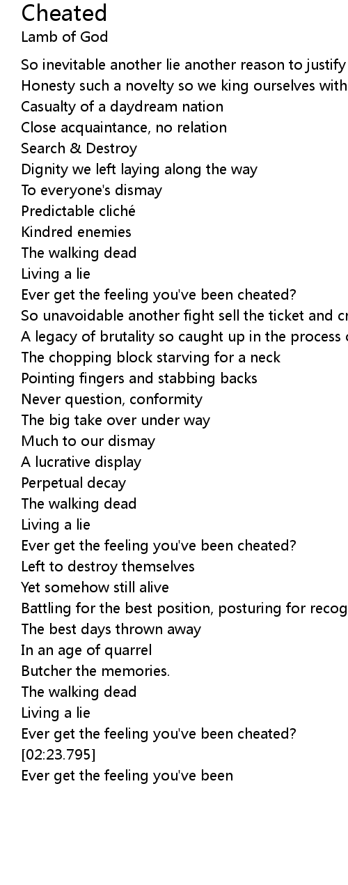 | [02:16.298] | Ever get the feeling you' ve been cheated? |