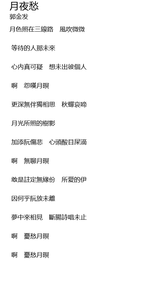 | 月色照在三線路 風吹微微 | |
