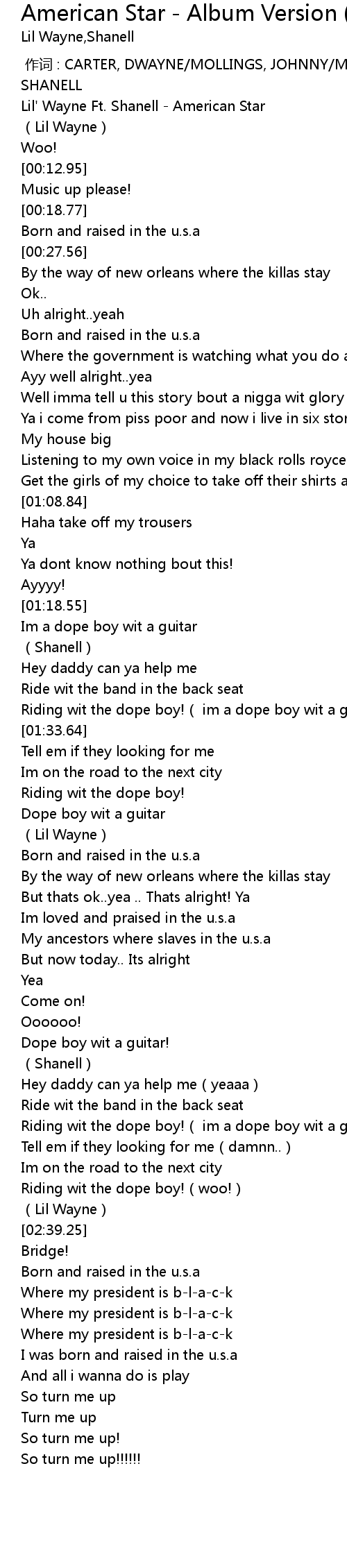 | [00:07.61] | Lil' Wayne Ft. Shanell American Star |
