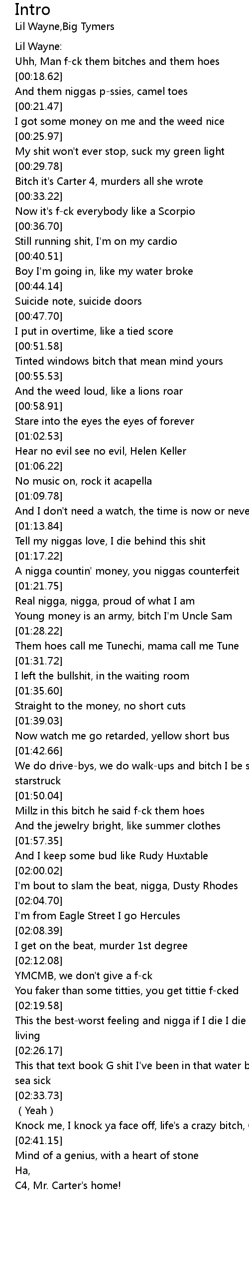 | [00:30.53] | Bitch it's Carter 4, murders all she wrote |