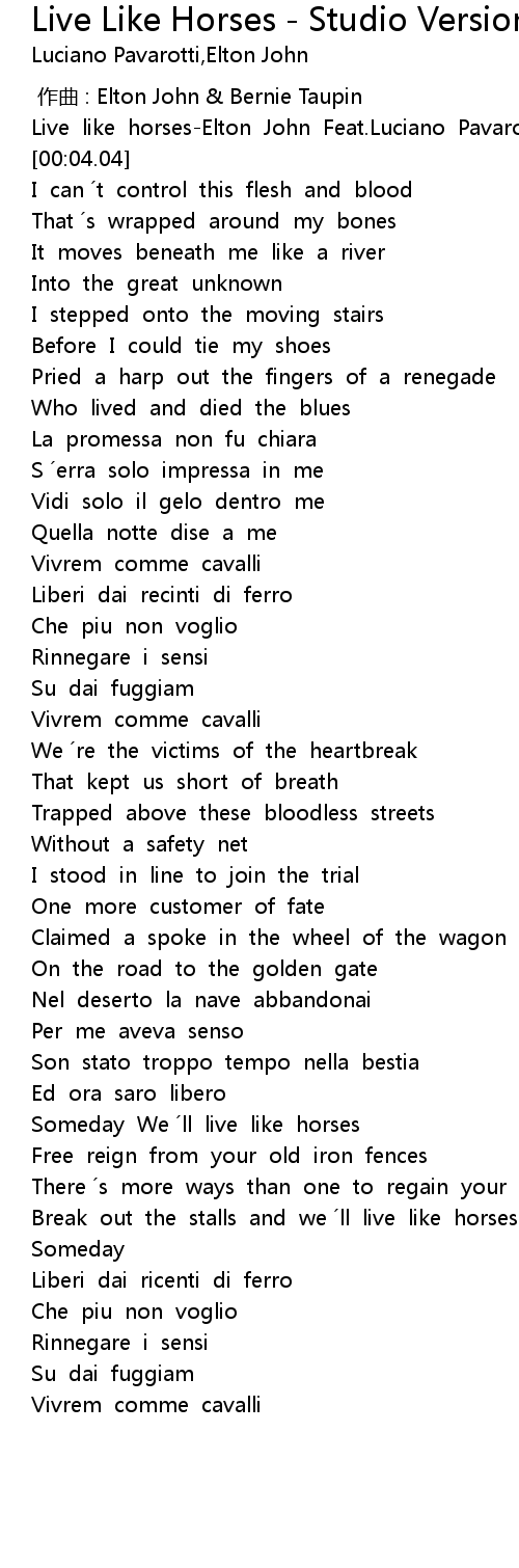 | [00:00.64] | Live like horses-Elton John Feat.Luciano Pavarotti |