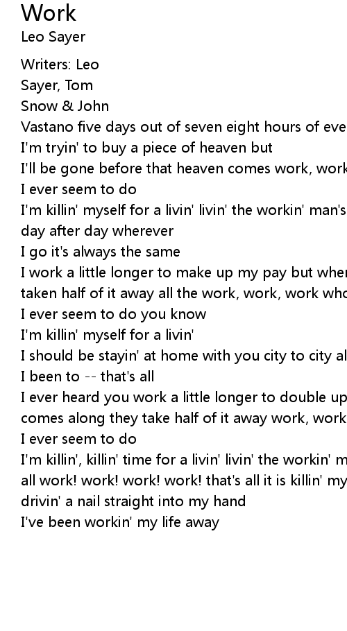| I work a little longer to make up my pay but when the cheque comes along they've taken half of it away all the work, work, work who nees it? all | |
