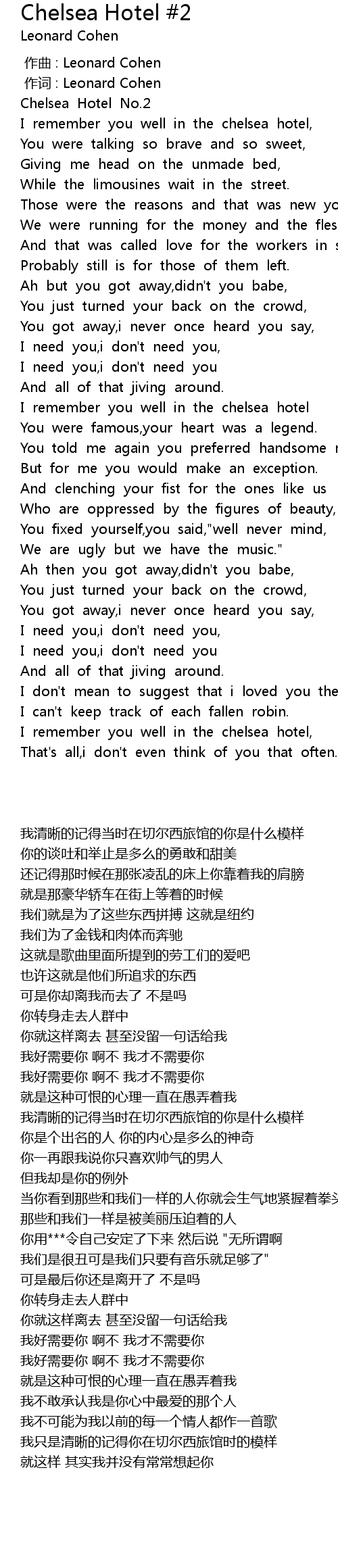 | [00:00.287] | 作词 : Leonard Cohen |