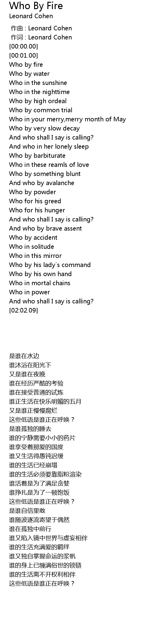 | [00:16.11] | Who by fire |