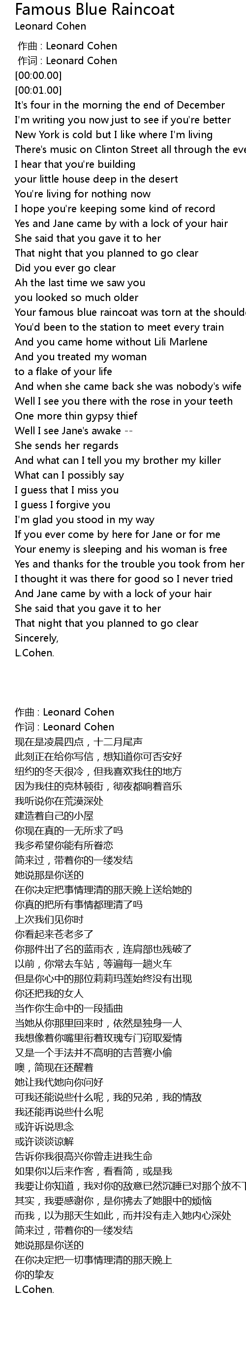 | [01:50.24] | Your famous blue raincoat was torn at the shoulder |