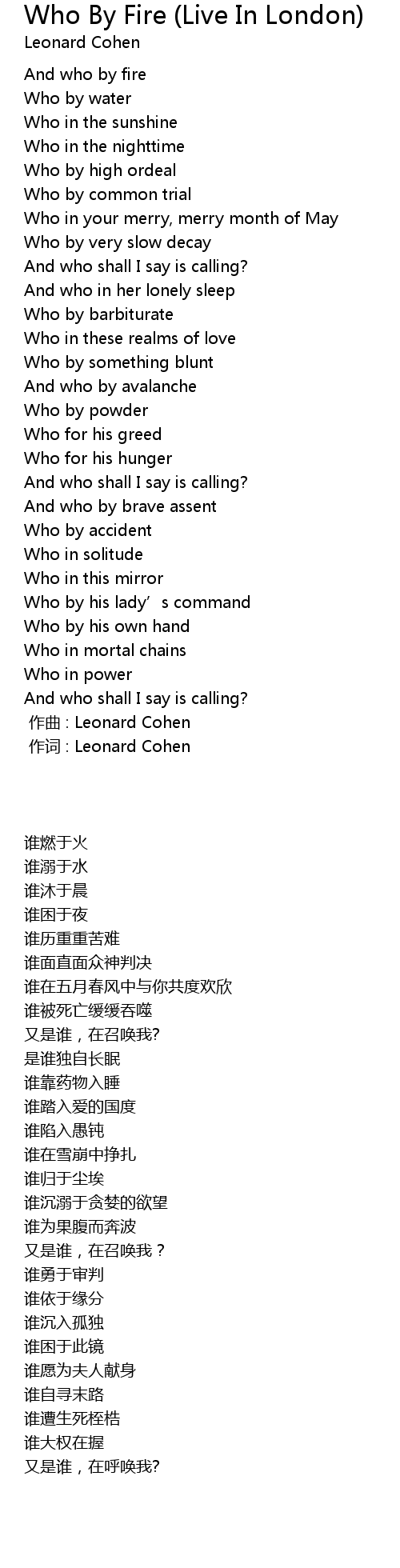 | Song | Who By Fire (Live In London) |