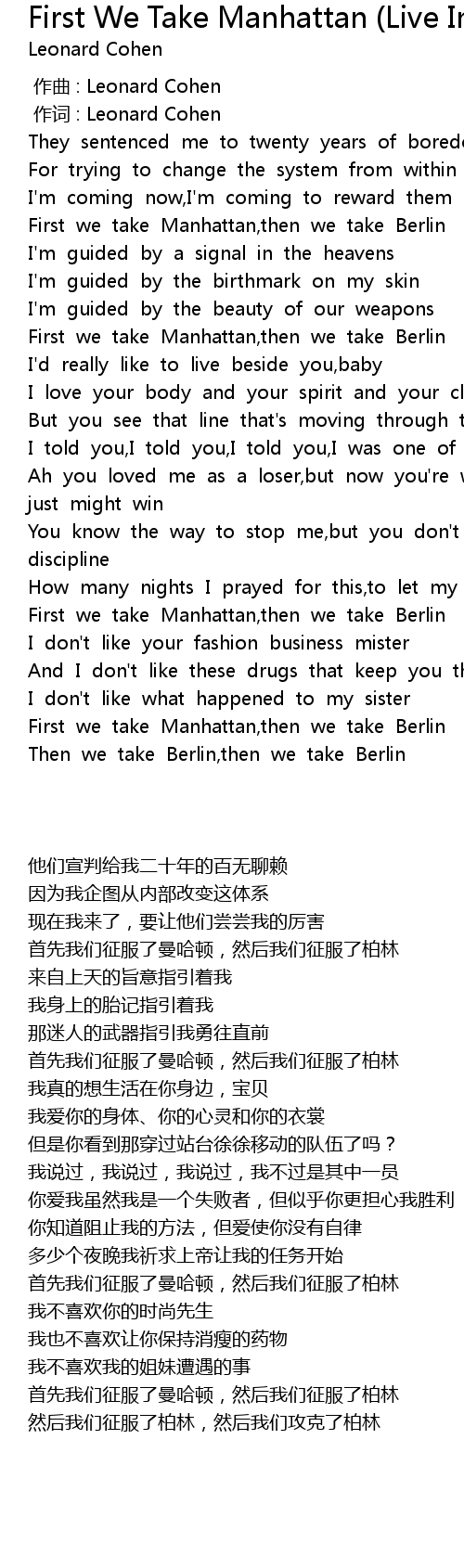 | [02:49.52] | First we take Manhattan,then we take Berlin |