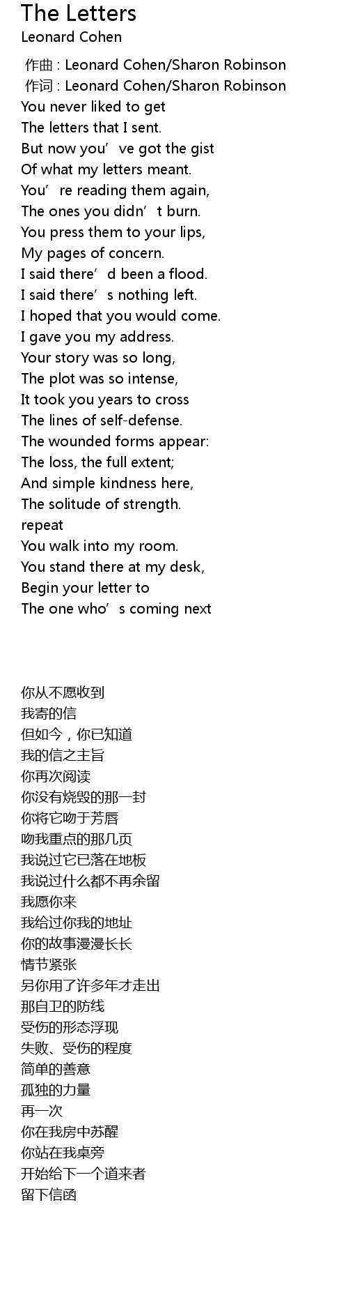 | [00:01.00] | 作词 : Leonard Cohen/Sharon Robinson |