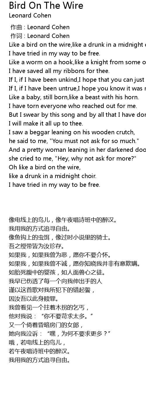 | [00:00.900] | Like a bird on the wire,like a drunk in a midnight choir |