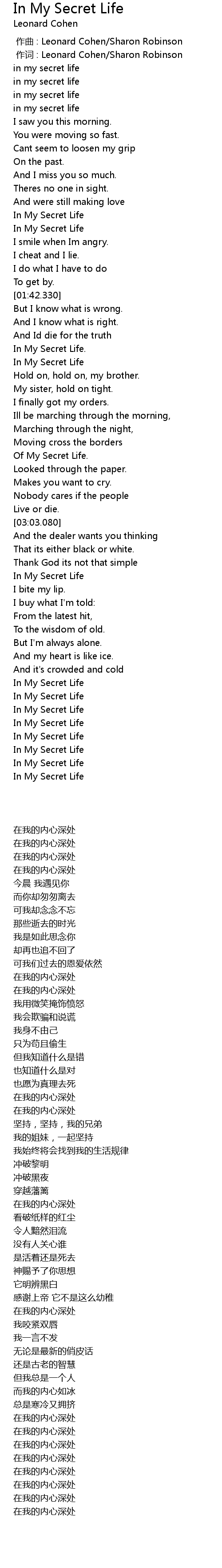 | [00:01.00] | zuò cí : Leonard Cohen Sharon Robinson |