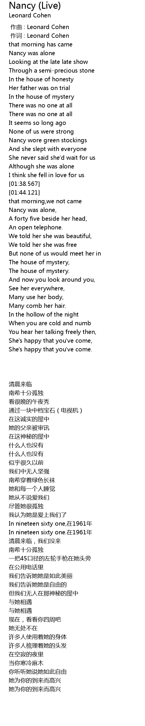 | [00:01.00] | 作词 : Leonard Cohen |
