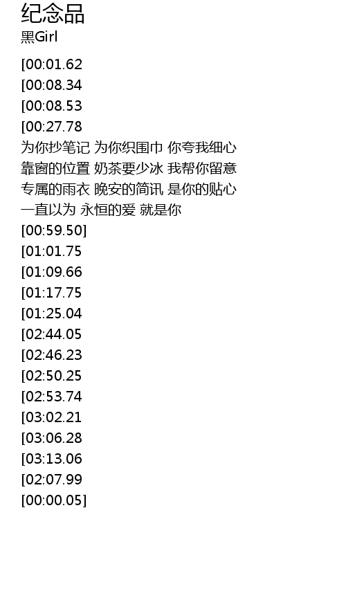 | [04:13.70][00:01.62] | 黑girl - 纪念品 |