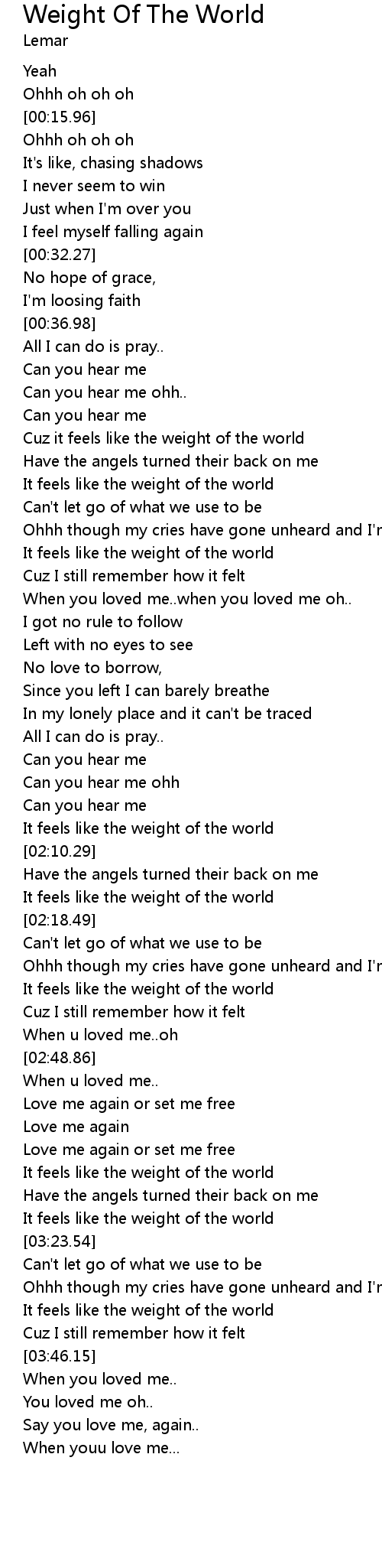 | [00:54.62] | Cuz it feels like the weight of the world |