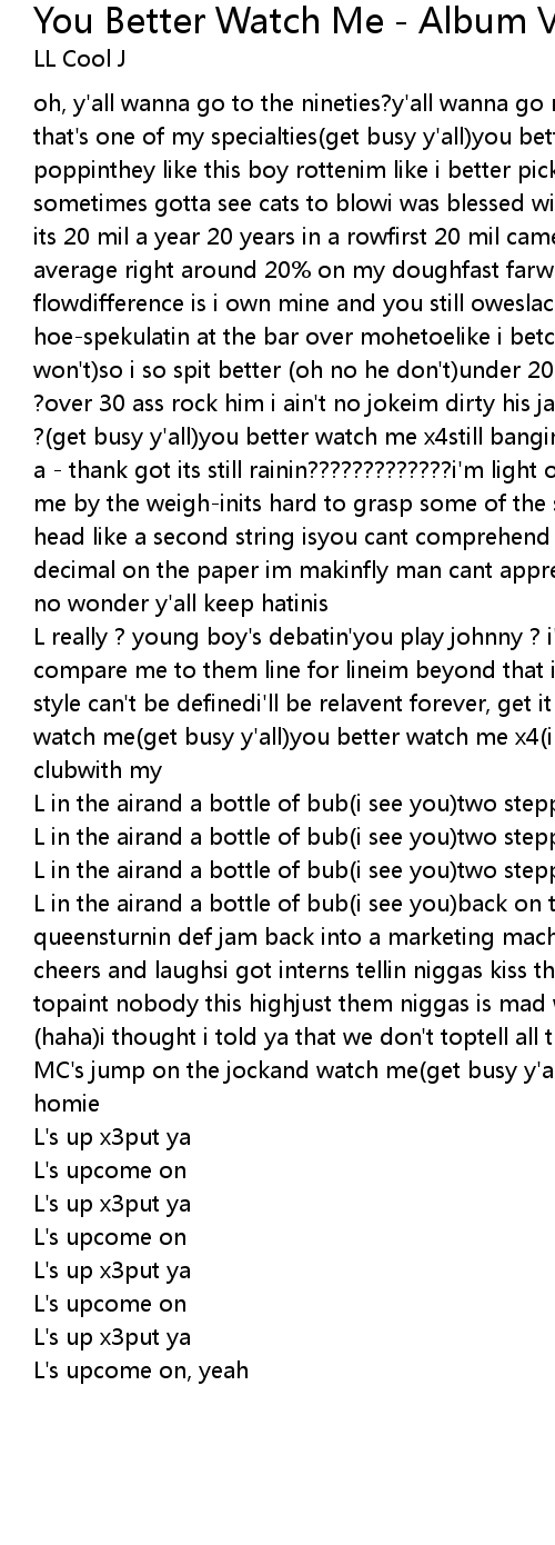 | L really ? young boy's debatin'you play johnny ? i'll keep on cakin'you can't compare me to them line for lineim beyond that i represent ? of timeclassic my style can't be definedi'll be relavent forever, get it through your mindjust watch me(get busy y'all)you better watch me x4(i see you)two steppin in the clubwith my | |