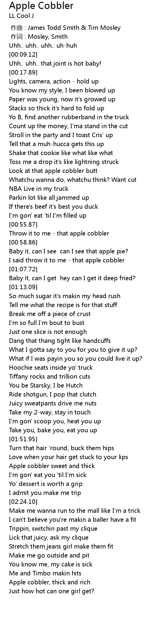 | [00:56.43] | Throw it to me that apple cobbler |