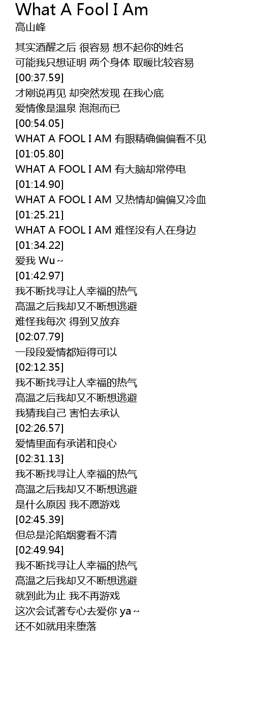 | [00:57.85] | WHAT A FOOL I AM yǒu yǎn jīng què piān piān kàn bú jiàn |