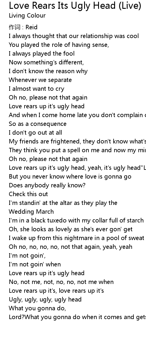 | Love rears up it' s ugly head, yeah, it' s ugly head" Love' s not so bad," they say | |