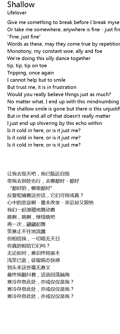 | [02:49.00] | The shallow smile is gone but there is this unjustified joy |