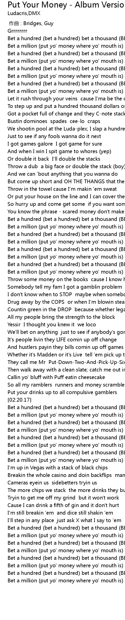 | [02:31.64] | Bet a hundred bet a hundred bet a thousand BET A STACK |