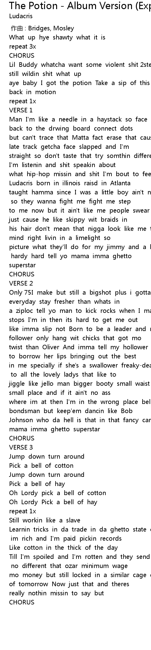 | [00:50.907] | what hip-hop missin and shit I'm bout to feel aboard Ludacris born in illinois raisd in Atlanta |